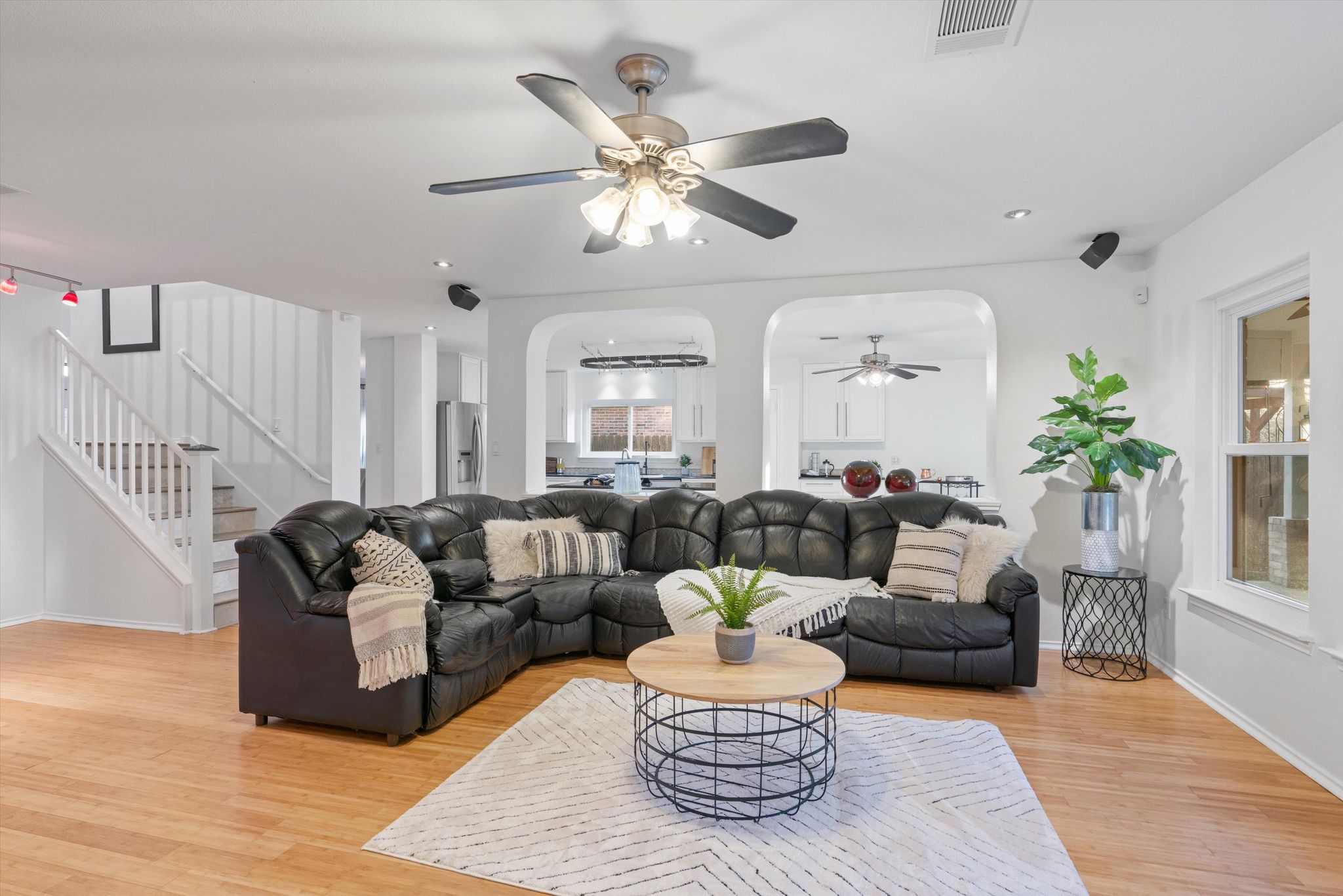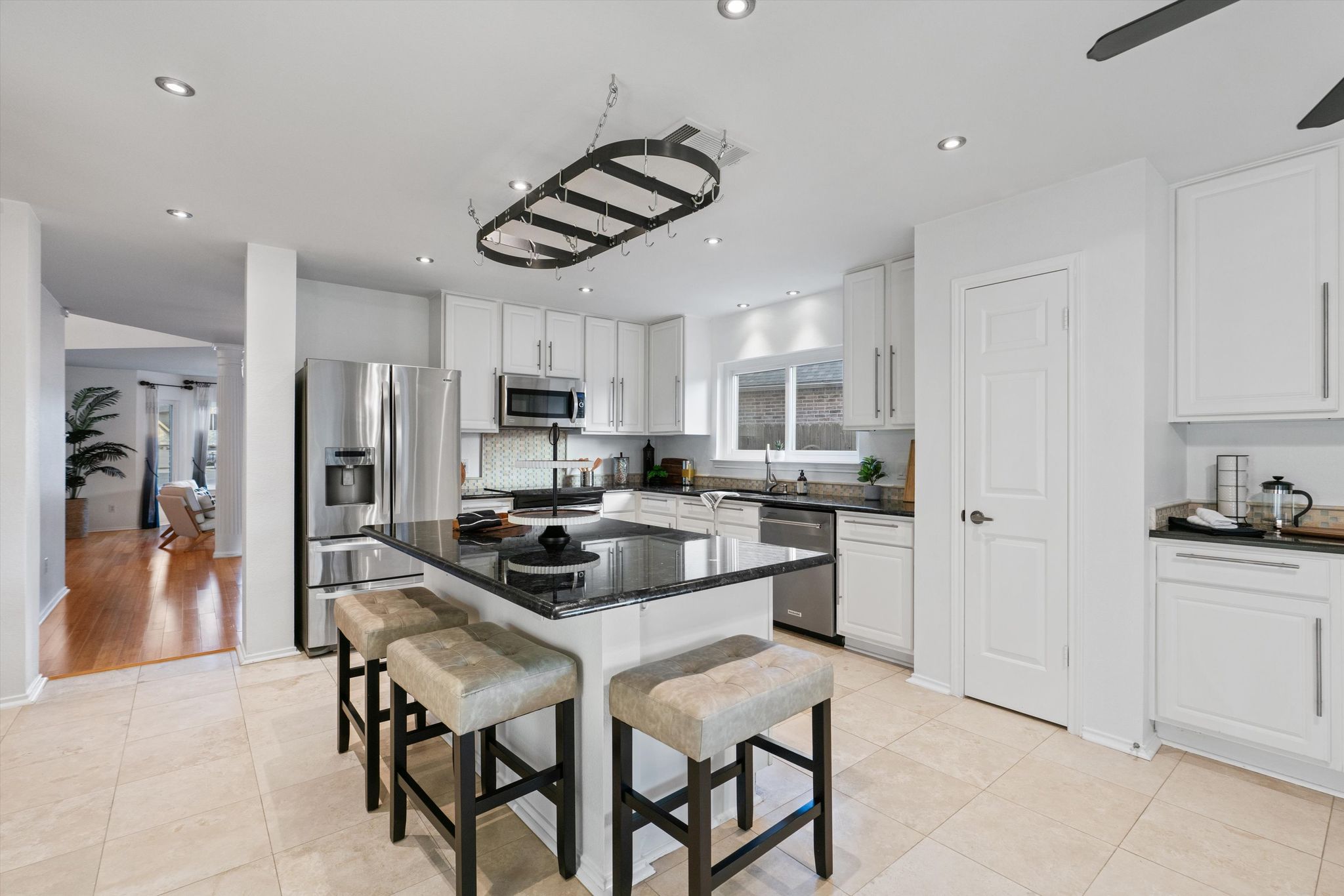 This home features a 3-car garage with overhead storage space providing ample room for vehicles and hobbies alike. The high ceilings and double-sided staircase bring a touch of refined style as you welcome your guests in the grand entryway. The heart of the home is an open concept living room and gourmet kitchen updated to inspire your inner chef featuring a center island, tall cabinets, granite countertops, and stainless steel appliances.