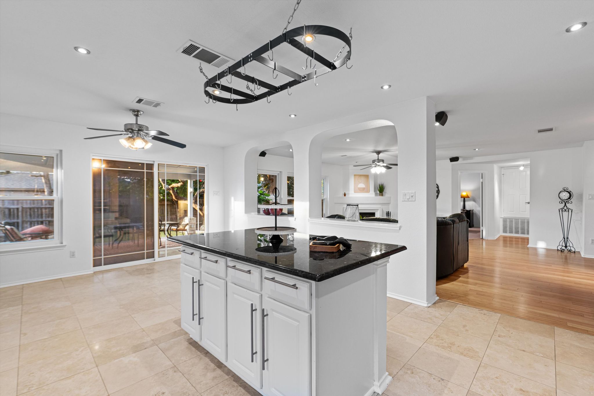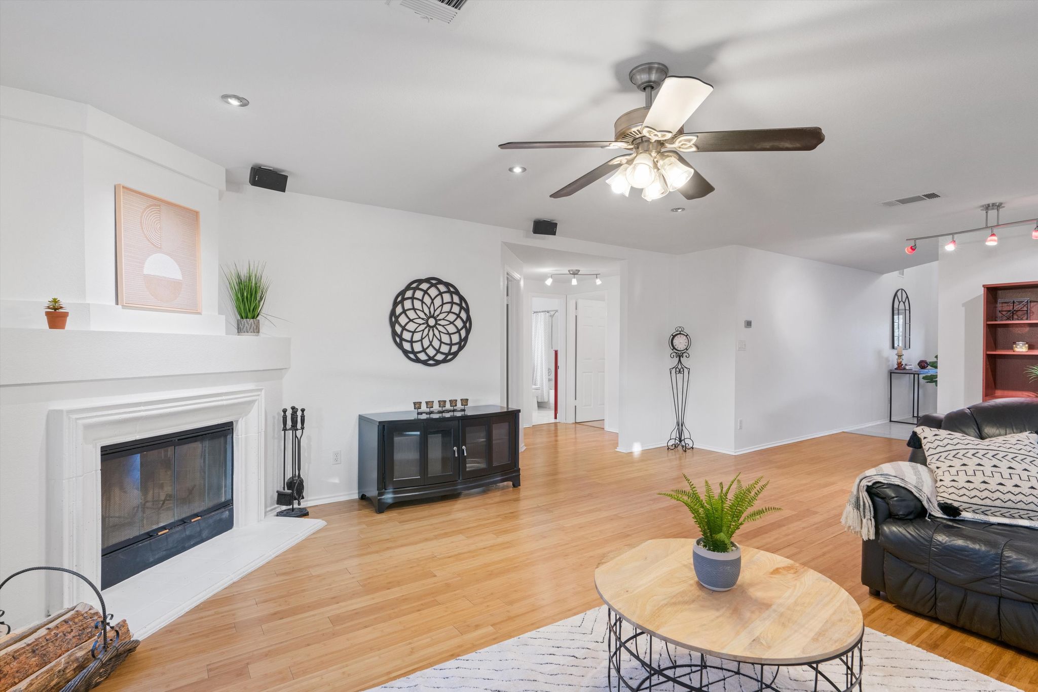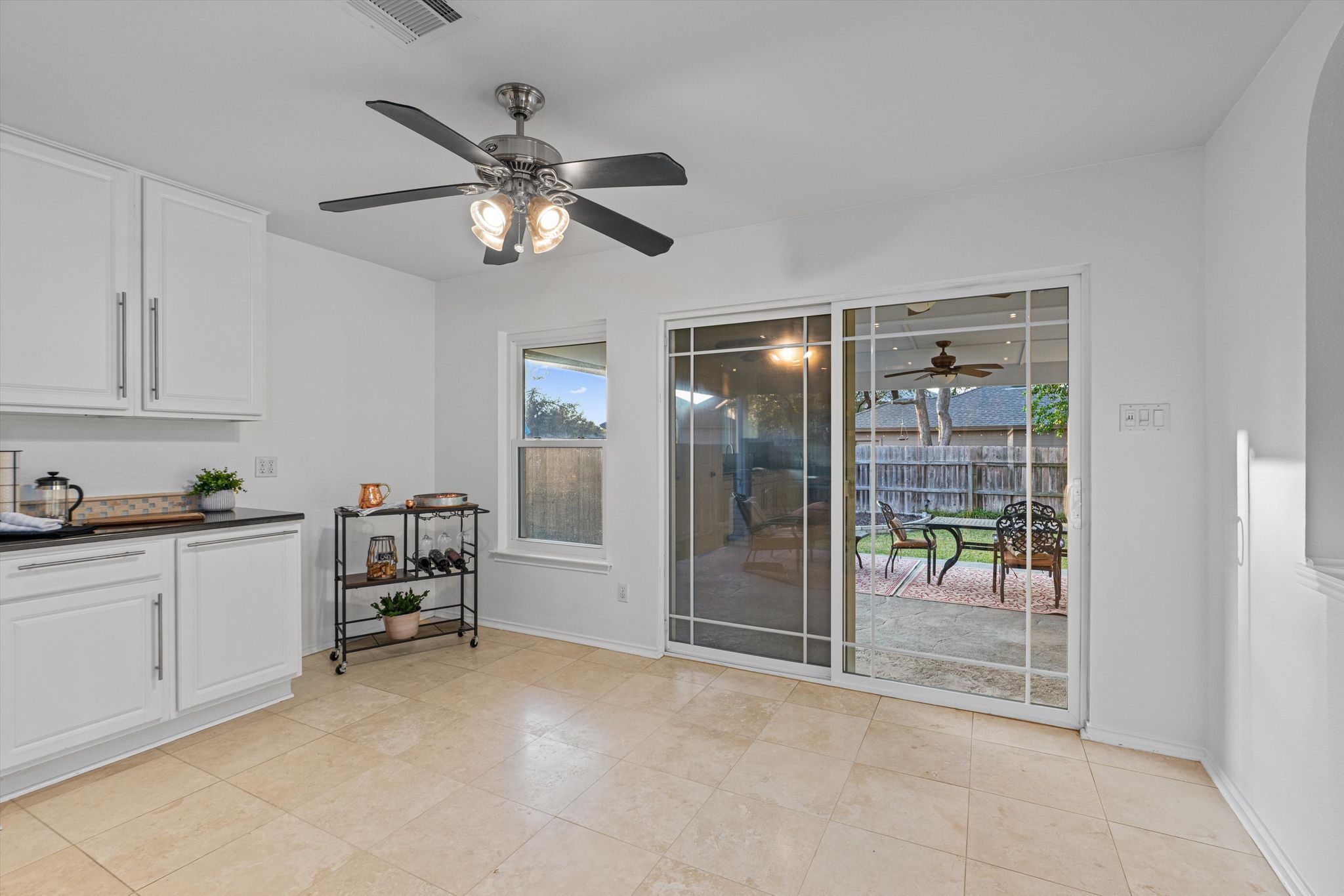 Bamboo flooring and travertine tile add an elegant touch to this home's aesthetic. Everything complements the fresh white paint throughout. An oversized covered patio offers a peaceful retreat, perfect for relaxing or entertaining. Enjoy the backdrop of a small grove of oak trees and landscaping, complete with a full sprinkler system and landscape lighting. A storage shed and raised garden beds will keep your green thumb working.