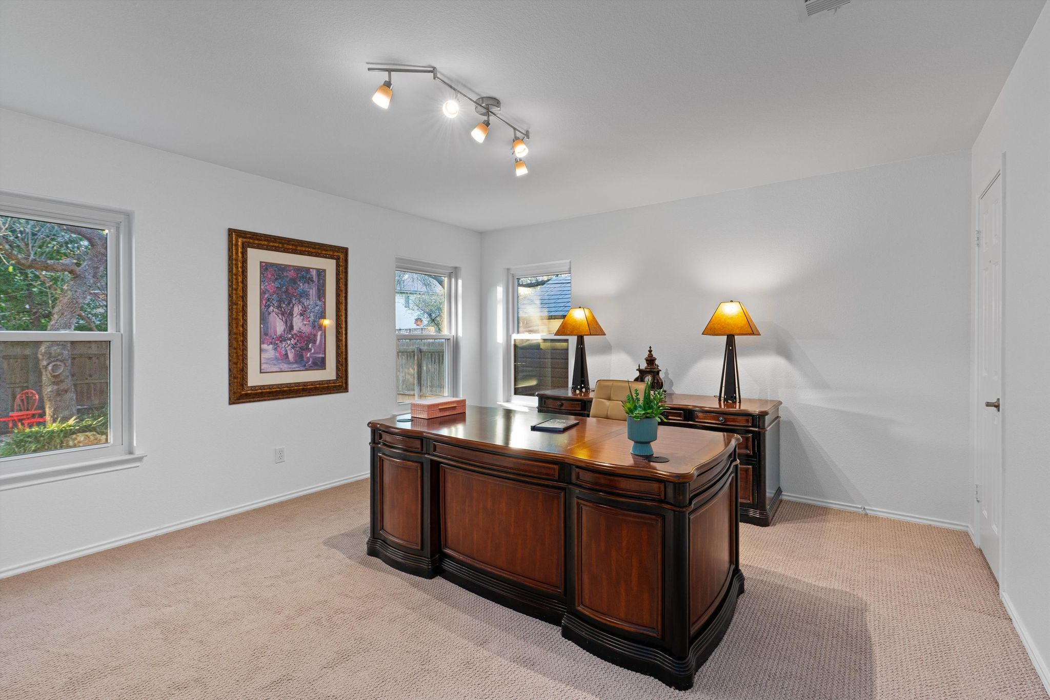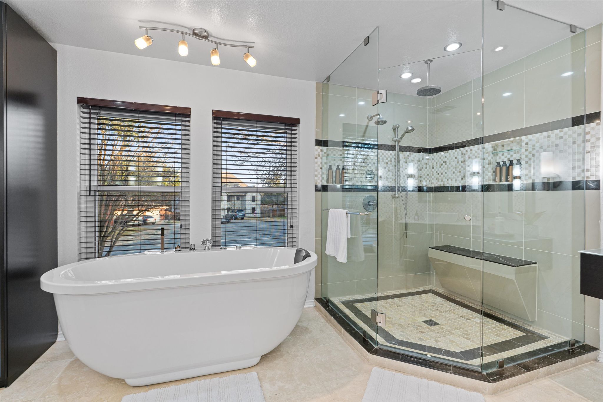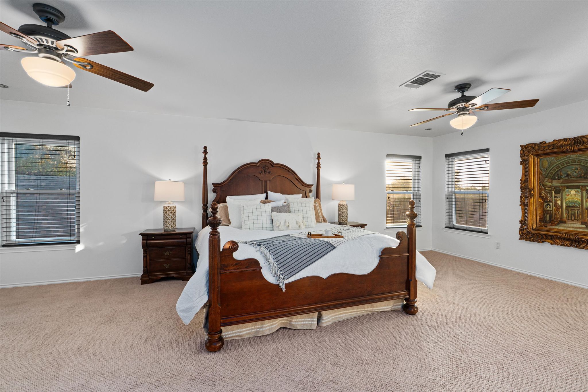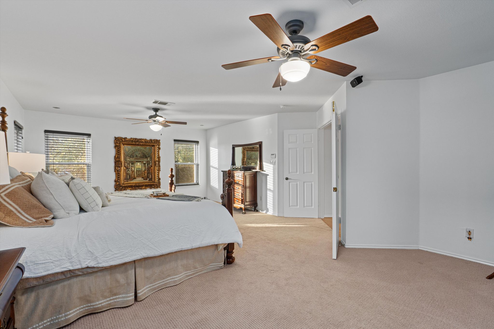 The primary suite features his and hers closets, an expansive walk-in shower, and a deep soaker tub.  Every day begins and ends in luxury. All the oversized bedrooms have walk-in closets and ample storage. The energy-efficient triple-pane windows are as cost saving as they are beautiful. Updated rocker switches, lighting, and pre-wiring for speakers bring all the details together.