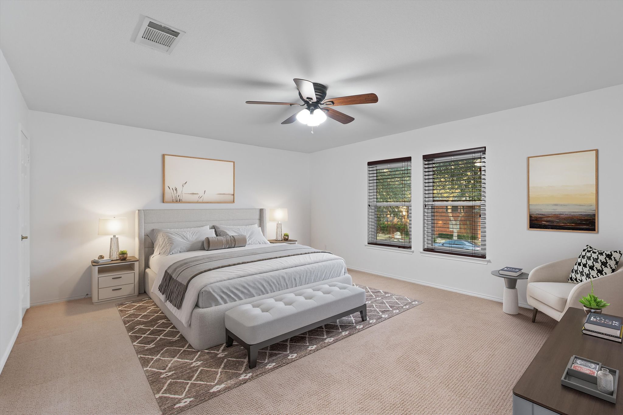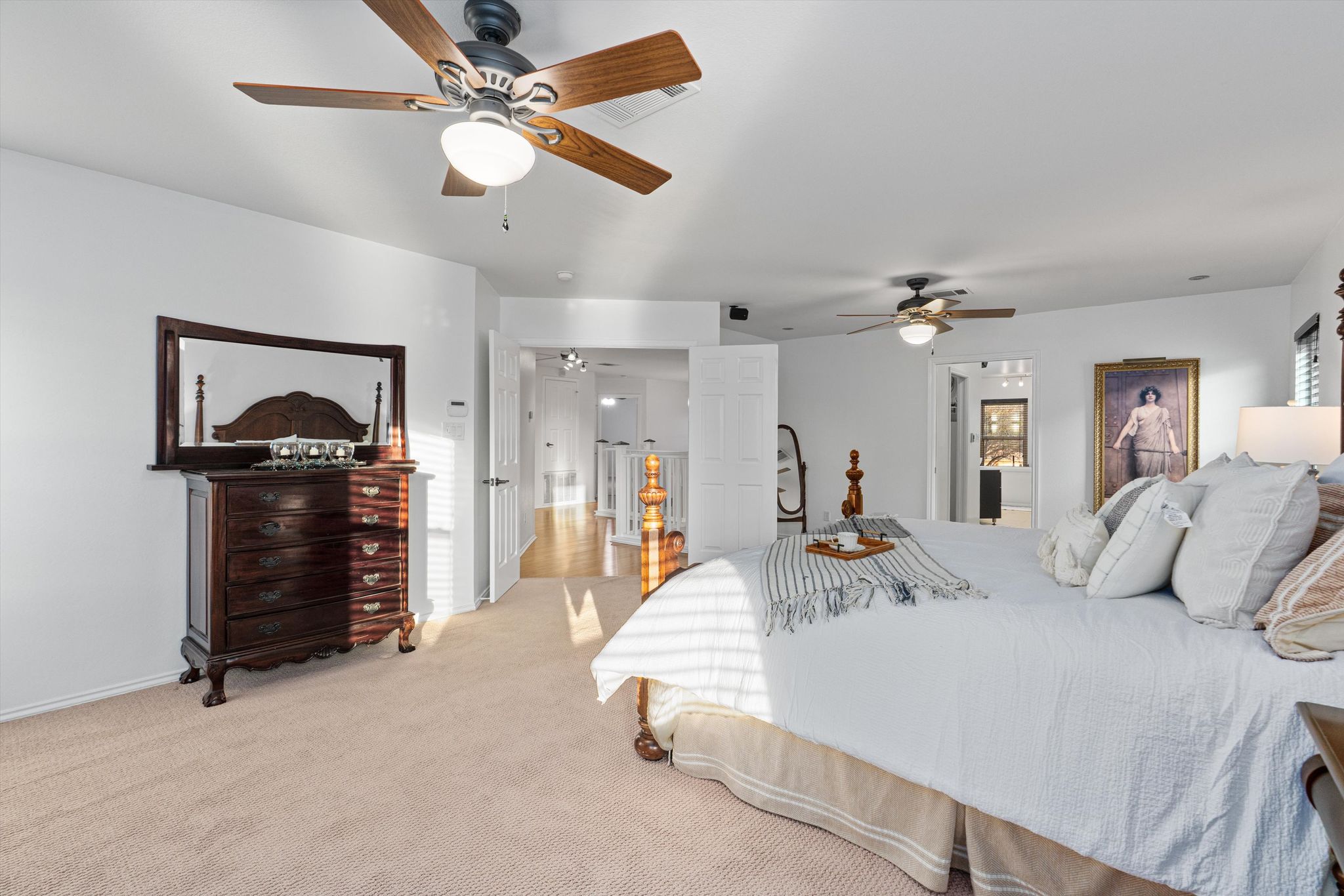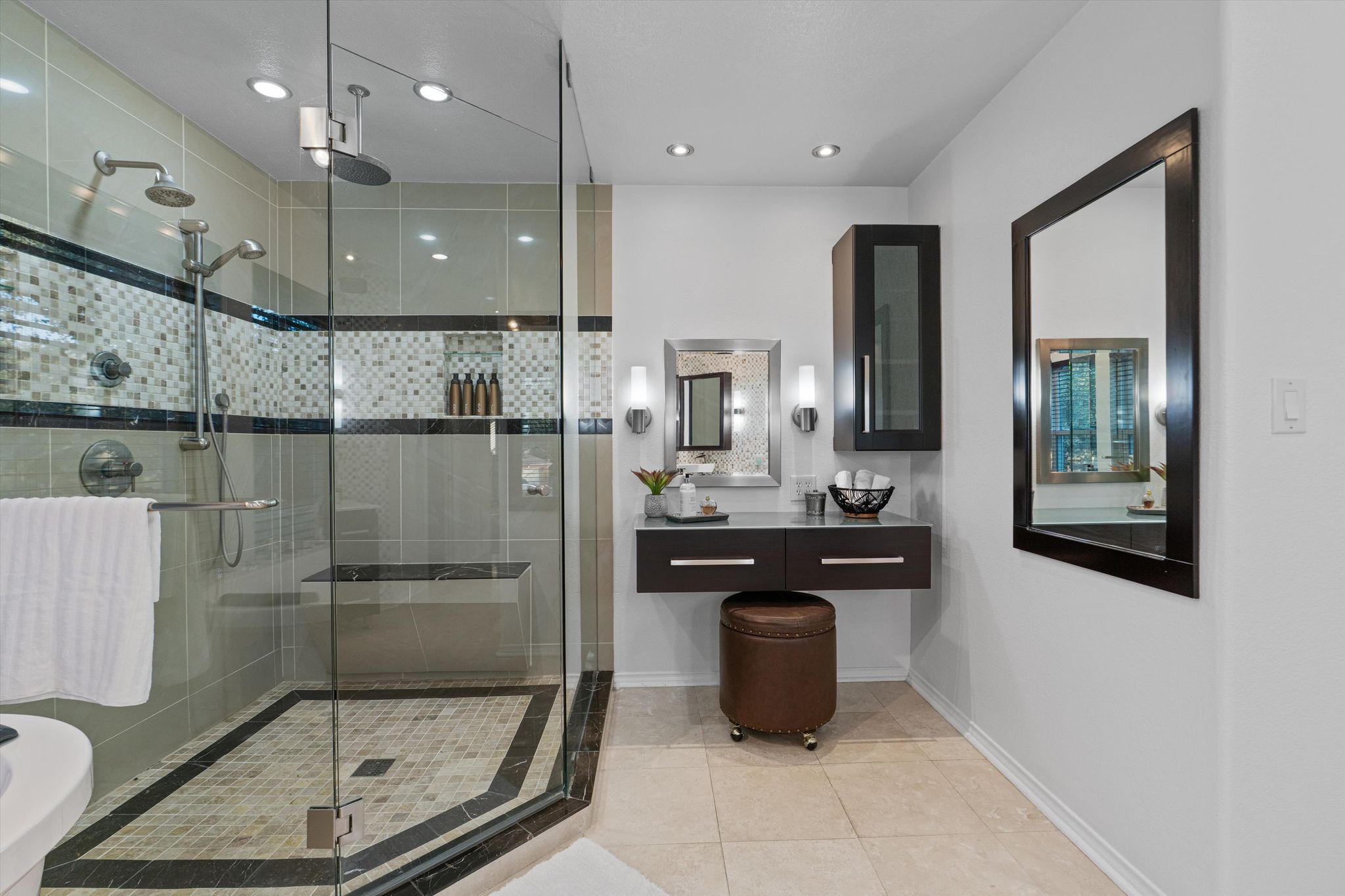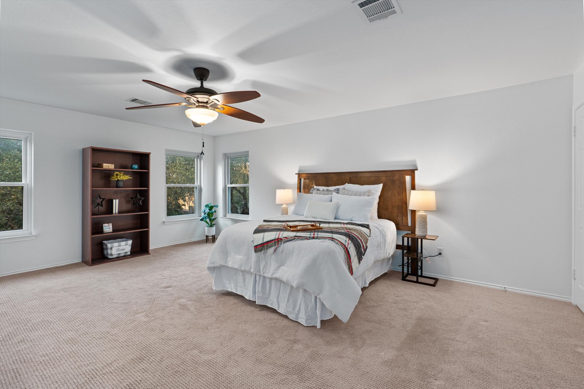 The primary suite features his and hers closets, an expansive walk-in shower, and a deep soaker tub.  Every day begins and ends in luxury. All the oversized bedrooms have walk-in closets and ample storage. The energy-efficient triple-pane windows are as cost saving as they are beautiful. Updated rocker switches, lighting, and pre-wiring for speakers bring all the details together.